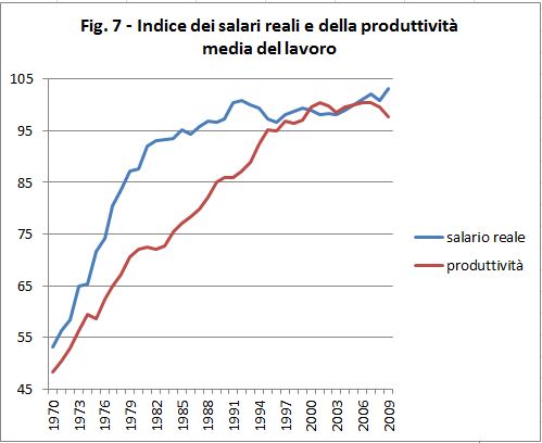 Credo che per ragionare in termini corretti su questo argomento sia utile guardarsi gli indici del salario reale e della produttività media del lavoro dal 1970 ai giorni nostri, riportati nella Fig. 7 di quel post, che qui riproduco per comodità.