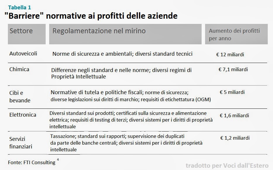 Per più di due decenni, le grandi aziende europee e statunitensi hanno fatto pressioni per una zona di libero scambio transatlantico attraverso organizzazioni come il Trans-Atlantic Business Dialogue (TABD), ora ridenominato Trans-Atlantic Business Council (TBC)5. In vista dei negoziati per il TTIP, molte associazioni industriali hanno adottato prese di posizione comuni che indicano una più stretta collaborazione transatlantica. Questa è una strategia esplicita per parlare ai negoziatori dell’UE e degli USA con una sola voce ed un insieme ben definito di interessi comuni6. In una nota interna che è trapelata, la Commissione Europea ha già dichiarato che intende agire nell’interesse dell’industria, concentrandosi particolarmente sui “settori che hanno espresso prese di posizione comuni (automobilistico, chimico, farmaceutico, della salute ed informatico)” – perché “possiamo contare sulla pressione congiunta dell’industria”7. Finora, la Commissione ha tenuto più di 100 riunioni riservate con i rappresentati delle lobby industriali, a porte chiuse, lasciando la società civile largamente all'oscuro dei fatti8.