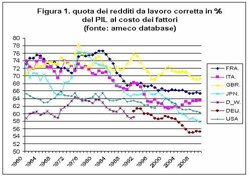 Ora, quale che sia l’andamento di tali imposte,[3] noi possiamo direttamente analizzare la distribuzione del Pil misurato al costo dei fattori, cioè considerato già al netto di quelle imposte, anche in questo caso seguendo la prassi normalmente adottata nella letteratura economica e nelle indagini statistiche su questi temi. La Figura 1 qui sotto riporta l’andamento della quota dei redditi da lavoro in vari paesi, corretta per tenere conto del lavoro autonomo, e presa come percentuale del Pil al costo dei fattori, cioè al netto della “quota del governo”. Si vede immediatamente che in Italia la quota dei redditi da lavoro è diminuita di circa 10 punti percentuali di Pil, e che specularmente è aumentata la quota dei profitti e degli altri redditi non da lavoro presi al netto delle imposte indirette, contrariamente a quanto sostenuto nell’articolo che stiamo discutendo.