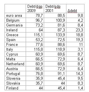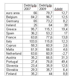 Le cose sono andate diversamente: la crisi è nata da eccessi di debito e di rischio assunti dalle banche e da altri intermediari finanziari, ed anche se l’epicentro è stato negli USA, le banche europee, ed in particolare quelle britanniche e irlandesi hanno partecipato con entusiasmo alla nuova versione delle vecchie “catene di S. Antonio”. Pertanto dal 2008 e ancor di più nel 2009 il debito pubblico crebbe dappertutto; qui di seguito (Tabella 1) sono riportati i livelli dei rapporti debito/pil e le variazioni 2007-2009