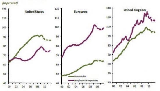 Fig.1: Il debito di famiglie e settore privato non finanziario nell’area Euro, USA e UK (2000-2010)