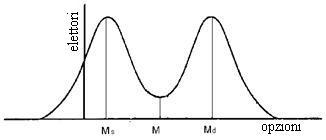 Il celebre teorema dell’elettore mediano assume l’ipotesi di preferenza a picco singolo, la quale indica che gli elettori non sono estremisti: un elettore di sinistra, ad esempio, preferirà sempre il centro all’estrema destra. Nondimeno nella realtà non sempre ciò accade, perché molte scelte, essendo “difficili”, rendono estremista l’elettore: sta meglio se converge verso l’una polarità o l’altra. Ma se, su tali scelte, le opinioni sono molto divaricate, vi è un addensamento a sinistra ed uno a destra. Vi sono allora due elettori modali (quelli le cui opinioni sono condivise dal più gran numero), mentre attorno all’elettore mediano si coagulano pochi voti, come si vede nella figura seguente[8]: