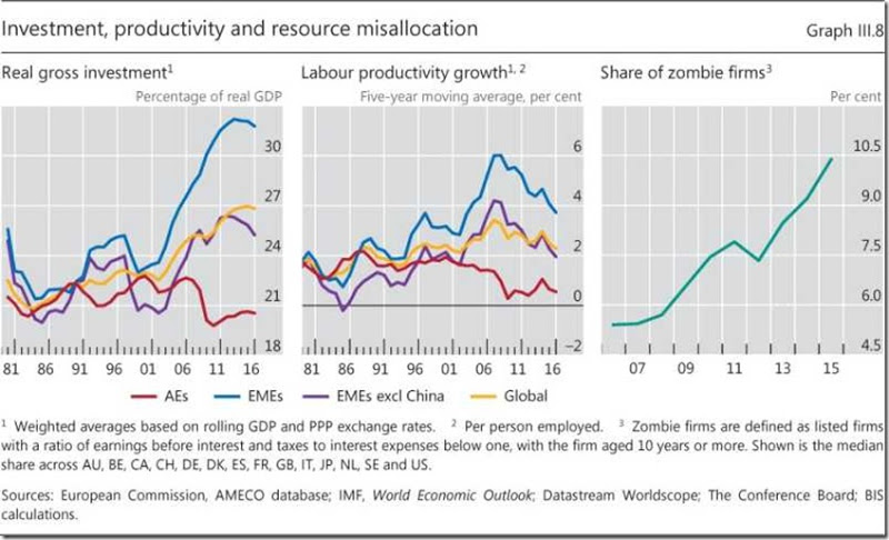 Infatti, è la bassa crescita della produttività in questa Lunga Depressione ad essere causata da una permanente mancanza di domanda, o Isteresi, o ad abbassare la redditività? Il recente rapporto annuale della "Bank for International Settlements" (agenzia di ricerca per le banche centrali globali) ha rilevato che la crescita della produttività è crollata a causa di «una persistente erronea allocazione di capitale e lavoro, come rispecchiato dalla crescente quota di imprese non redditizie. Infatti, la quota delle imprese zombie - i cui interessi passivi eccedono i guadagni al lordo delle imposte e degli oneri finanziari - si è incrementata in maniera significativa nonostante gli insolitamente bassi tassi di interesse».