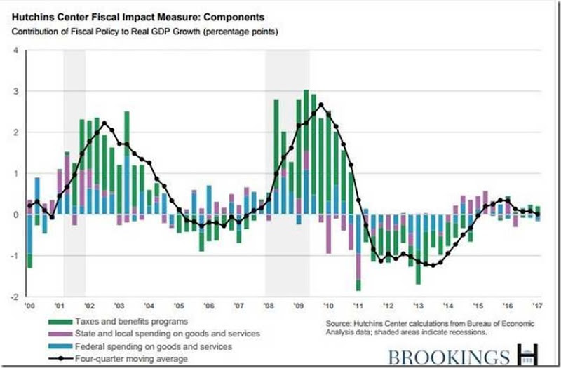 Beh, la prima cosa che mi colpisce in questo grafico è che, secondo l'Hutchins Center, l'austerità fiscale negli Stati Uniti è finita nel 2015. Ma nella crescita reale del PIl, a partire da allora, non c'è stata nessuna ripresa. In effetti, la crescita reale del PIL nel 2016, all'1,6%, è stata quella con il tasso annuo più basso dalla fine della Grande Recessione. Ma forse, Wren-Lewis sta sostenendo che è l'Isteresi quella che ora sta operando per mantenere costantemente bassi la produttività e la crescita della produzione. Ma anche se fosse così, lo stimolo fiscale probabilmente ha poco effetto nel far girare le economie capitaliste a partire da questo.