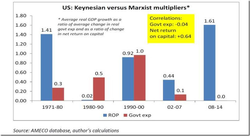In un'economia dominata dal capitalismo è molto più convincente un conducente che pilota investimenti e crescita, vale a dire la redditività del capitale, qualcosa che viene del tutto ignorata dalla teoria keynesiana. In passato, ho mostrato che la crescita del PIL reale è fortemente correlata ai cambiamenti nella redditività del capitale (il moltiplicatore marxista, se vogliamo). In trent'anni su cinquanta, ed in particolare nell'attuale periodo successivo alla Grande Depressione, il moltiplicatore marxista è stato considerevolmente maggiore del moltiplicatore keynesiano della spesa pubblica. E negli altri vent'anni, il moltiplicatore keynesiano è stato solo leggermente più elevato e non è mai riuscito ad andare oltre "1". Ci sono perciò state più dimostrazioni del fatto che il moltiplicatore marxista è più rilevante, ai fini della ripresa economica sotto il capitalismo, di quanto lo sia il moltiplicatore keynesiano.