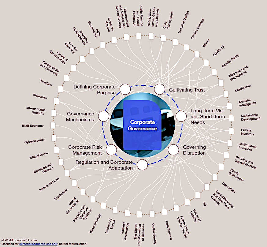 Uno di questi è che la dipendenza[23] di tanta parte del mondo da poca altra, e dei molti dai pochi, è riletta dagli autori come “interdipendenza”. A tal fine viene fatto uso del cosiddetto pensiero della complessità. Per Schwab ed il suo coautore il primo fattore di analisi è dunque prendere atto che la “interdipendenza” orizzontale invalida il pensiero a “silo”, capace solo di dividere i singoli problemi in compartimenti specialistici. Nell’esempio che fa il libro, i disastri infettivi hanno effetti diretti sui “fallimenti della governance globale”, sull’instabilità sociale, la disoccupazione, le crisi fiscali e le migrazioni involontarie. E ognuna di queste aree di crisi ne influenza altre nelle dimensioni economiche, societarie, geopolitiche, ambientali e tecnologiche.