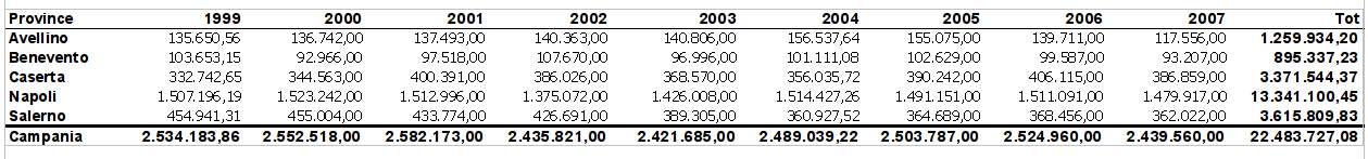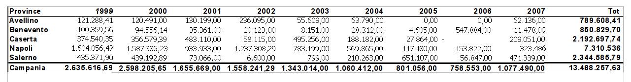 In questa sede ci limitiamo a dare una rappresentazione dei dati raccolti dalle diverse fonti per un’analisi preliminare della congruità delle quantità prodotte con quelle smaltite. La Tab. 3 mostra il Flusso di Rifiuti Indifferenziati per provincia in Campania dal 1999 al 2007.