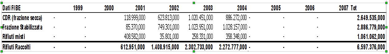 La Tab. 4 é stata costruita sulla base dei dati dichiarati dalla Impregilo dal 2001 al 2004 sulle quantità FRI trasformato in CDR, frazione organica stabilizzata (FOS) e sovvalle. Il CDR è stato negli anni stoccato in siti appositamente allestiti in attesa della costruzione dell’inceneritore di Acerra; il FOS, destinato in principio ad essere utilizzato per interventi di bonifica ambientale, vista la scarsa qualità realmente prodotta negli impianti campani, è stato smaltito in discarica insieme al sovvalle e agli altri scarti.