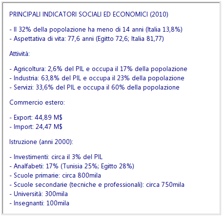 Grazie al forte sviluppo economico, nel quarantennio gheddafiano la popolazione libica è cresciuta notevolmente, è più che triplicata. Oggi conta circa sei milioni e mezzo di abitanti, cui si aggiungono un milione/due milioni di emigrati, provenienti da Egitto, Medio Oriente e dall’Africa subsahariana. Questi immigrati, che costituiscono circa la metà della forza lavoro della Libia, sono impiegati nei grandi complessi petrolchimici, nell’edilizia e in parte anche nei servizi (ospedali, scuole, alberghi).