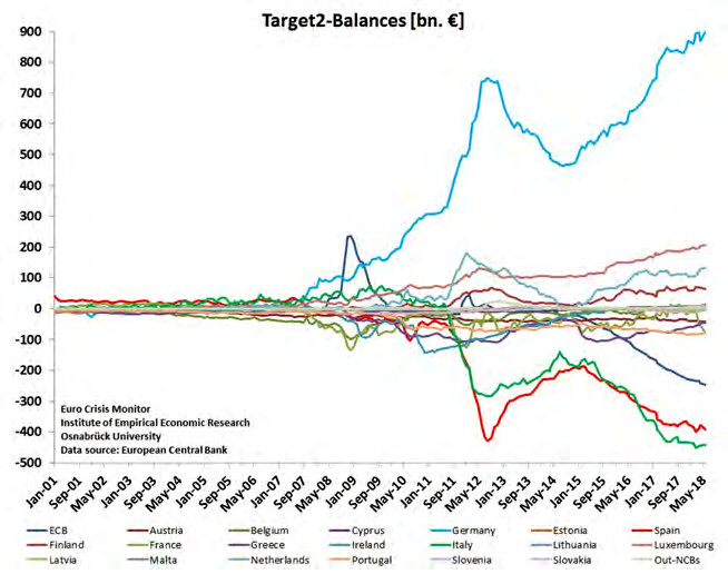 "Nell'ambito del sistema di pagamento di Bretton Woods, la necessità di rimborsare il debito in valuta estera con degli attivi che non potevano essere creati dal nulla, manteneva i saldi entro limiti ristretti. Nell'eu-rosistema invece non è previsto alcun rimborso. Questo spiega l'enorme aumento dei saldi Target. In effetti la Germania è diventato un enorme negozio self-service nel quale puoi far segnare sul conto a tuo piacimento, senza che il proprietario del negozio possa chiedere il pagamento dei suoi crediti" scrive il 17 luglio. E ancora: "Ci sono essenzialmente cinque accordi istituzionali che hanno consentito la creazione asimmetrica di credito all'interno dell'eurosistema nei primi anni della crisi finanziaria, diciamo fino al 2012 circa. Il primo è il sistema Target stesso. Il Trattato di Maastricht non dice nulla a proposito. Questo sistema è stato creato dalle banche centrali stesse, senza chiedere nulla ai Parlamenti. [...] Il rischio di una perdita diventa concreto nel momento in cui le altre banche centrali, a causa dei loro debiti Target, non possono più far fronte ai loro impegni di pagamento all'interno dell'eurosistema. Così ad esempio un fallimento dello Stato italiano [...]. La situazione sarebbe molto simile se l'Italia dovesse uscire dall'euro e smettesse di onorare i suoi debiti Target. Si spera che questi scenari estremi non si materializzino mai, tuttavia sono rilevanti per l'ulteriore sviluppo dell'eurozona nella misura in cui forniscono ai Paesi in crisi una potenziale arma di minaccia finalizzata alla creazione di una 'unione di trasferimento'. Il nuovo governo italiano ha giocato apertamente questa carta. O i Paesi del nord mettono mano al borsellino oppure dovranno farlo con l'uscita dalla moneta unica, se necessario tramite il fallimento della propria banca centrale". (8)