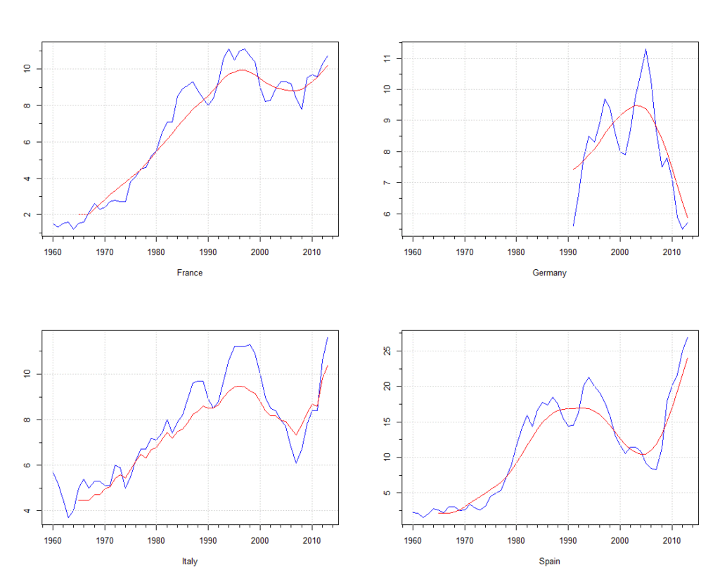 Figura 3. In blu il tasso di disoccupazione reale e in rosso il NAWRU, dati scaricati da AMECO nel 2013, al culmine della crisi del debito sovrano. La Commissione stimava allora che la Spagna avesse un tasso di disoccupazione ottimale del 24%.