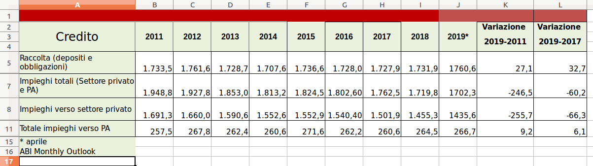La politica del rigore fiscale non ha portato ad alcun risultato positivo in termini di risanamento finanziario, ma ha provocato guasti profondi all’economia reale. E l’intero sistema economico italiano si è piantato, dopo le crisi bancarie. Come se non bastassero gli effetti costrittivi dell’avanzo primario, anche il credito all’economia è crollato: gli impieghi a favore del settore privato, famiglie ed imprese, sono passati dai 1691 miliardi del 2011 ai 1435 miliardi di aprile scorso: sono 256 miliardi in meno. Una enormità, visto l’effetto demoltiplicatore.