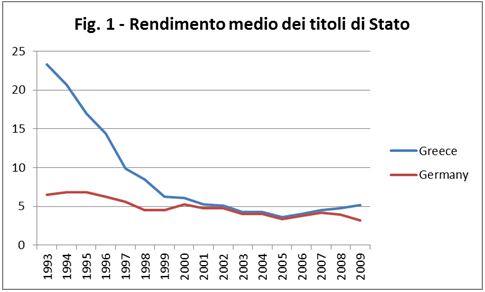 La visione che si tende a diffondere è questa: i greci (come gli italiani) avrebbero dilapidato i benefici conseguiti con l’entrata nell’euro, benefici rappresentati dal calo dei tassi di interesse. A sostegno di questa tesi si mostrano normalmente i grafici riferiti al costo medio del debito pubblico, che manifestano una convergenza impressionante: