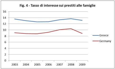 Quello che non sapete, e forse non dovete sapere, è che nel mercato finanziario dell’età dell’euro, perfettamente integrato, non tutti i tassi di interesse erano livellati. A una banca tedesca conveniva molto più prestare a un cittadino greco che a un cittadino tedesco. Non ci credete? Ecco i grafici dei tassi di interesse sui prestiti alle famiglie (IMF, serie 60PHSZF... delle International Financial Statistics, edizione dicembre 2010. La fonte non fornisce dati confrontabili prima del 2003, ma ci interessano anche poco, perché a me interessa farvi capire perché è esploso il debito privato nel primo decennio di questo secolo):