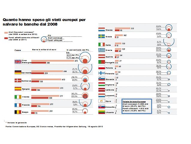 4. ingiuste: il meccanismo di risoluzione bancaria mette sullo stesso piano le banche che sono già state salvate a spese dei bilanci pubblici dei paesi di appartenenza e banche che non hanno ricevuto un euro in aiuti di Stato. Si tratta in tutta evidenza di un criterio che danneggia il nostro Paese. Per chiarire questo aspetto consentitemi di aprire una parentesi: le cifre impegnate o erogate dagli Stati europei a favore delle rispettive banche a partire dal 2008 sono cifre senza precedenti.