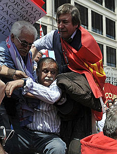 Stupiscono in questo contesto due cose: il fatto che Rinaldini non abbia smentito l'episodio ma anzi definisce teppisti i presunti aggressori quando sembra che il tafferuglio sia nato da persone del palco che volevano impedire al rappresentante dei Cobas di prendere la parola; stupisce la durissima condanna pronunziata dal "Manifesto" con un corsivo durissimo. "Da oggi, o di qua o di la". E' stata inferta una dolorosa ferita che fa da spartiacque".