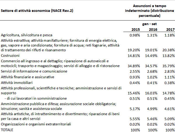 Inoltre, per confermare i dati Eurofound sulla scarsa qualità delle offerte di lavoro in Italia, basta guardare alla distribuzione delle nuove assunzioni nel nostro paese, riportati mensilmente dall’Osservatorio sul precariato Inps, secondo cui circa il 35% delle nuove assunzioni a tempo indeterminato tra il 2015 e il 2017 si concentrano nei settori dei servizi a scarsa produttività: commercio all’ingrosso e al dettaglio; riparazione di autoveicoli e motocicli; trasporto e magazzinaggio; servizi di alloggio e di ristorazione.