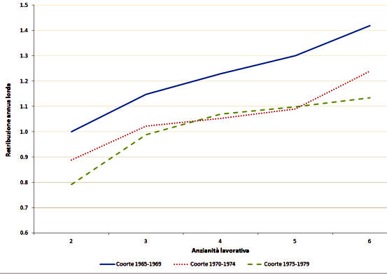 Tuttavia, per quanto riguarda le caratteristiche dei lavoratori italiani bisogna tener presente che l’abbassamento della qualità (e spesso anche quantità) delle condizioni lavorative è generalizzato e riguarda anche i cosiddetti lavoratori qualificati (skilled). In particolare, come mostrano Naticchioni-Raitano-Vittori (2016) nel grafico qui sotto, l’evoluzione delle retribuzioni dei lavoratori italiani si riduce nel tempo, ma in misura maggiore per i laureati nati tra il 1975 e il 1979 relativamente ai colleghi delle coorti precedenti.