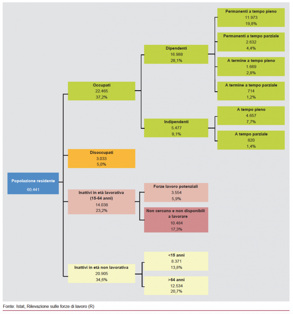 Proprio nei giorni scorsi l'Istat ha pubblicato l'Annuario 2016 che, tra tante statistiche e dati, contiene una chiarissima rappresentazione del nostro Paese che, sebbene aggiornata al 2015, è ancora validissima. Su 60,441 milioni di residenti (ai quali si aggiungono i residenti irregolari) il numero di persone che lavorano è di 22,465 milioni, pari al 37,2%, quindi circa un terzo della popolazione ha un lavoro. I rimanenti si dividono in chi è inattivo per questioni d'età, in quanto minore di 15 anni o over 65, pari a 20,095 milioni (34,6%), un 5% di disoccupati (3,033 milioni) e una enorme schiera di inattivi in età da lavoro pari a ben 14,038 milioni, il 23,2% della popolazione.