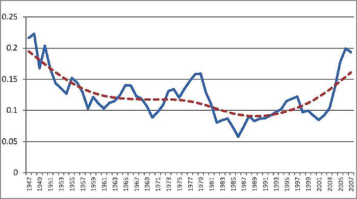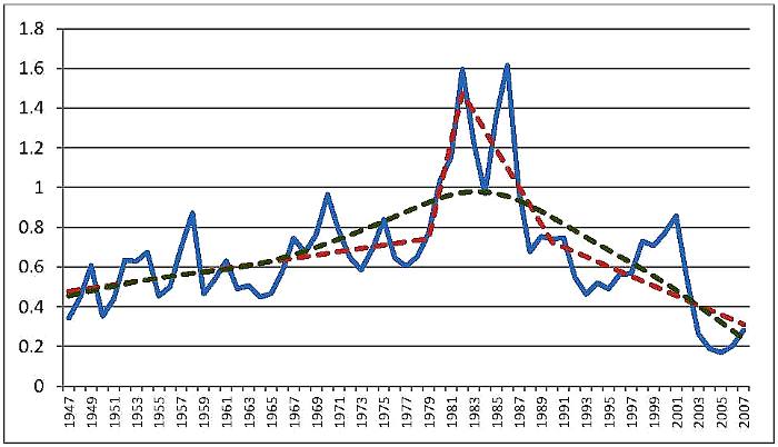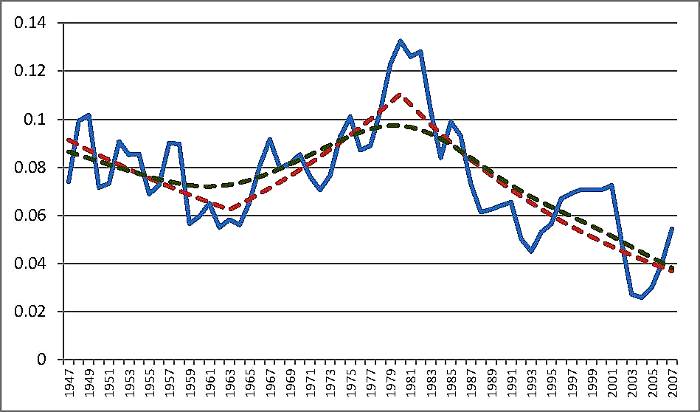 Il trend nonlineare (linea rossa tratteggiata) è declinante fino al 1989, momento in cui si inverte, recuperando in vent’anni circa il 73% della diminuzione del periodo 1947-19892.