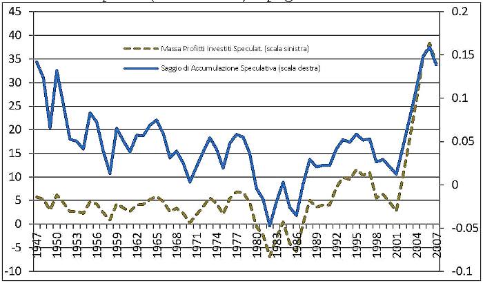 Grafico 5. Usa. Settore corporate. Saggio di accumulazione speculativa e massa dei profitti (miliardi di US$) impiegati nella finanza. 1947-2007