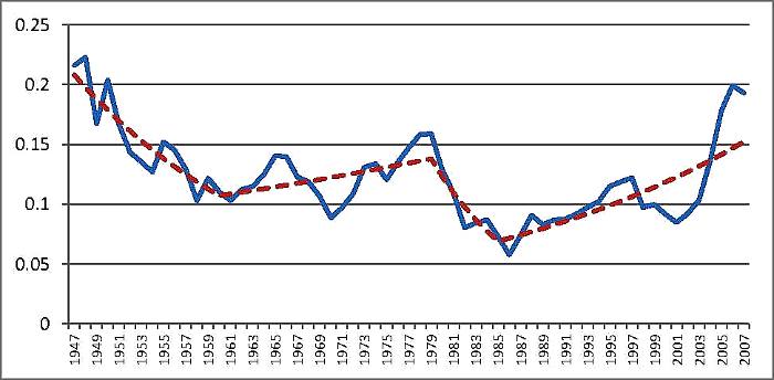 Grafico 2. Usa. Saggio del profitto come nel Grafico 1 con trend lineare segmentato. 1947-2007