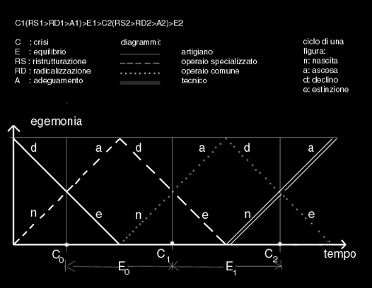 Il diagramma rappresenta schematicamente lo sviluppo dei cicli della lotta di classe e il corrispondente sviluppo di una classe attravarso la successione di figure. Per fissare le idee il diagramma è riferito al modo di produzione capitalistico.