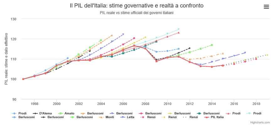 Abbiamo anche un altro e non banale fenomeno circa le previsioni economiche: le stime di crescita della Commissione Europea tra il 2015 e 2018 (autunno) sono sistematicamente più basse rispetto alla crescita del PIL che effettivamente si realizza. Perché sono sempre così basse quando nella storia le previsioni economiche sono quasi sempre più alte dei risultati reali? Non è che la Commissione Europea sottostimi la crescita per imporre delle misure economiche più restrittive? Dall’altra parte, le stime del governo italiano, di qualsiasi governo italiano, sono sempre più alte di quella che sarebbe plausibile, con un errore medio in termini di PIL reale di 0,25% per lo stesso anno5, di 1,15% per l’anno successivo e di 1,45% per quello ancora successivo6.