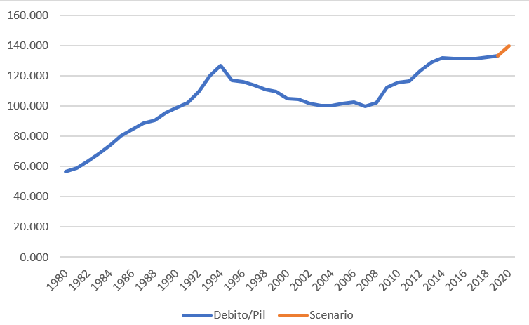Soffermiamoci un attimo sul secondo, che è l'unico del quale i cretini parlano (sorprendentemente, cinque anni dopo questo articolo e nove dopo questo c'è ancora qualcuno in giro che non ha capito come stanno le cose, ma va bene così). Se prendiamo le cifre di cui disponiamo ora, che sono ovviamente tutte delle stime, e utilizziamo le note equazioni di accumulazione del debito, tenendo ogni altro valore uguale, e considerando le stime del FMI e della NADEF, visto che la NADEF dava un indebitamento netto di -2.2, cui si aggiunge un -1.1 per i noti motivi, arrivando a -3.3, con il Pil in calo di -3.4, immaginando (per essere molto generosi) un'inflazione all'1%, e quindi una crescita nominale al -2.4, succede che in un solo anno dal 133% di rapporto debito/Pil si passa al 140% (provare per credere, gli elementi li avete tutti). Questo nello scenario ottimistico. Secondo me si rischia di andare oltre il 140% del rapporto debito/Pil.