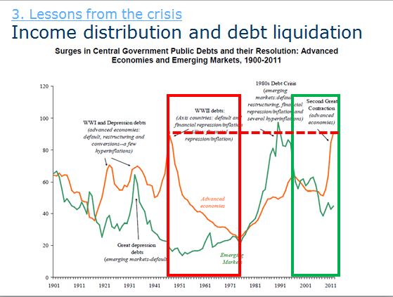 noterete un unico episodio significativo e prolungato di discesa del debito pubblico nei paesi avanzati in cui la "repressione" (cioè regolamentazione) finanziaria abbia giocato un ruolo, ed è quello successivo alla Seconda guerra mondiale, nel periodo in cui le politiche keynesiane, rese sostenibili dal controllo dei movimenti internazionali di capitale, determinarono una crescita moderatamente inflattiva, con il costo del finanziamento del Tesoro tenuto sotto controllo tramite la cooperazione fra Tesoro e Banca Centrale.