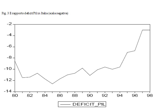 Ma il vero contraccolpo del “divorzio” sull’economia italiana dei primi anni ottanta fu – come anticipato sopra - il brusco innalzamento dei tassi di interesse reali. Finì di colpo una condizione economica che durava dal 1972; ancora nel 1980, in Italia, il tasso di interesse depurato dall’inflazione osservata ex post (oltre il 20%), era negativo per qualcosa come cinque punti percentuali; nei tre anni successivi l’interesse divenne positivo per valori compresi tra il 2 e il 3%, fino a superare il 6% nel 1984: in quell’anno la spesa per interessi rappresentava il 12% del Pil italiano. Successivamente, anche se il rapporto tra deficit e Pil cominciava a calare (nel grafico a salire verso lo zero) i tassi di interesse italiani continuavano ad essere più alti che altrove in termini reali, e questo per sostenere la parità del cambio all’interno dello SME.