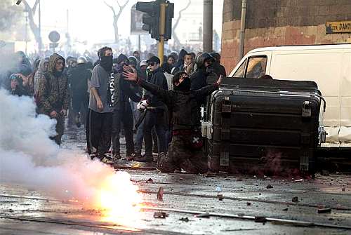 Questa scritta “- Cucchi + Raciti” campeggiava in bella mostra durante gli scontri del 15 ottobre. Spiega più la distanza tra i movimenti pacifici e radicali di quanto si possa immaginare. Perché, mentre sulle banche e il precariato il linguaggio può anche trovare punti in comune tra diverse esperienze di movimento, da parte dai movimenti che si vogliono maturi non c’è mai stata attenzione su questi temi. Dei diritti civili in ambiti tipicamente giovanili. Non solo ma tra i manifestanti “maturi”, nella piazza del 15, c’erano esponenti di partiti che le leggi militari del dopo Raciti le hanno velocemente approvate. Accentuando distanza e incomprensibilità tra culture di movimento. E’ evidente poi che la dinamica di scatenamento dei riot è quella del rovesciamento simbolico del’ordine del potere vigente. Per cui torna trasfigurata la figura dell’ispettore Raciti, si devastano banche, si distruggono madonne, si bruciano tricolori. Più che alla dinamica dello scontro di piazza è a questo rovesciamento simbolico che bisogna guardare per capire il significato del comportamento di questo tipo di movimenti. Si interviene direttamente per rovesciare nell’immediato un ordine simbolico ritenuto, non a torto, insopportabile. E si parla, sempre direttamente, all’immaginario profondo della società. In questo senso possiamo definire questo tipo di comportamenti come una radicalizzazione del modello di movimento basato sul primato dell’opinione pubblica. E’ frutto della sua crisi come lo era lo Schwarze Bloc tedesco rispetto al modello di partecipazione civica nella Germania dei primi anni ’80. Si parla al resto della società, evocandone la sollevazione, direttamente con il linguaggio del suo sostrato simbolico profondo piuttosto che con quello dei linguaggi mediati dai comportamenti ritenuti ragionevoli, creativi e politicamente razionali. In questo modo si scatena, come sempre in questo genere di riot, un’enorme energia sociale sollevata. I simboli del potere sono archetipici, si innestano profondamente nel corpo sociale ed è infatti forte la reazione all’operazione del loro rovesciamento e della loro trasfigurazione. Non a caso i media sono avidi di questo: condannano e trasmettono allo stesso tempo. La diretta Sky degli scontri a piazza San Giovanni si è rivelata un prodotto adrenalinico perfetto, specie nel tardo pomeriggio, tra uno stacco pubblicitario e un posticipo e l’altro della serie A. Il potere dell’immaginario del rovesciamento dei simboli immesso nel palinsensto, in una società mediale, non va trascurato. Ma va anche capito che la maggior parte di questo genere di comportamenti non ha ancora fatto il salto di complessità che va dai comportamenti radicali alla strutturazione politica, al radicamento nel territorio, alla capacità di governo delle stesse proprie immagini proposte. Si parla, e con forza, alla società ma non si è complessivamente in grado di connettersi complessivamente con il corpo sociale scosso dalla crisi.
