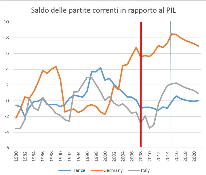 Che la Francia non stia meglio di noi risulta peraltro da un dato che lo stesso professor Giavazzi cita selettivamente: il saldo delle partite correnti. Guardate come convergono Francia e Germania: