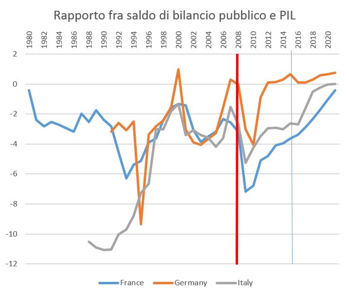Noi, deboli come la Francia, ci siamo indeboliti ancora di più rispettando le assurde regole europee e rientrando immedatamente entro quel valore totalmente infondato del 3% di rapporto deficit/PIL che la Francia rispetterà forse nel duemilasettordici (nel 2014, ultimo dato consolidato, era ancora al 4%). Questa scelta politica assurda è stata dettata, fra l'altro, dagli editoriali del professor Giavazzi, il quale, come gli ho amabilmente ricordato, ha capito solo il 7 settembre 2015 quello che qui avevamo capito il 16 novembre 2011, ovvero che la crisi non dipendeva dal debito pubblico ma da quello privato, e che quindi l'attacco ideologico portato da Monti, con il beneplacito di Giavazzi, allo stato, inteso come intervento pubblico nell'economia, non ci avrebbe salvato ma affossato.