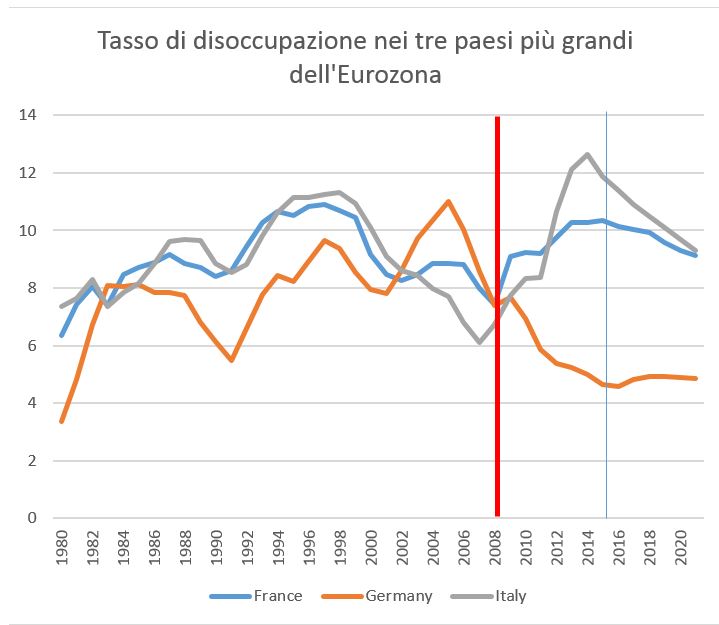 Pensate! Sull'omogeneità di Francia e Germania ho fatto proprio l'ultima lezione del mio corso di Politica economica, dove, parlando della disoccupazione, ho mostrato questa slide:
