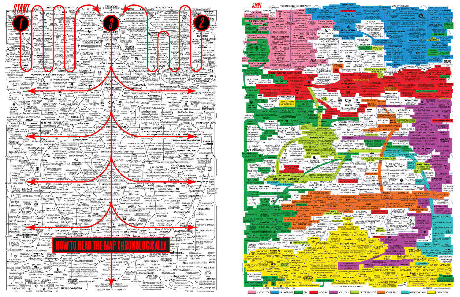 Quello che ho proposto è un riassunto molto semplificato. Le sacre scritture di QAnon formano un corpus abnorme che la comunità continua ad aggiornare fagocitando ogni notizia. Per rendersene conto, basta guardare le mappe del Q-Web realizzate dall’artista grafico Dylan Louis Monroe.