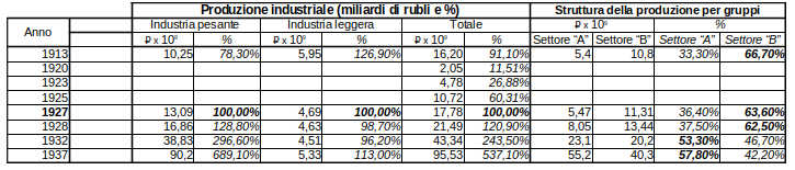 Non importava nemmeno che l’emulazione stacanovista fosse compiuta parallelamente alle attività già previste dal piano di produzione, di fatto stravolgendo l’organizzazione del lavoro a esso preposta, provocando squilibri fra reparti della stessa fabbrica e, aumentando di scala, fra settori economici. In particolare, alcuni dati possono aiutarci a inquadrare sial’impeto con cuila locomotiva sovieticasi catapultò, nel giro di due piani quinquennali, nel consesso delle potenze industriali, che – soprattutto – il modo con con cui questo era accaduto. Esaminiamo questa tabella (valori espressi in rubli del 1926-27)22: