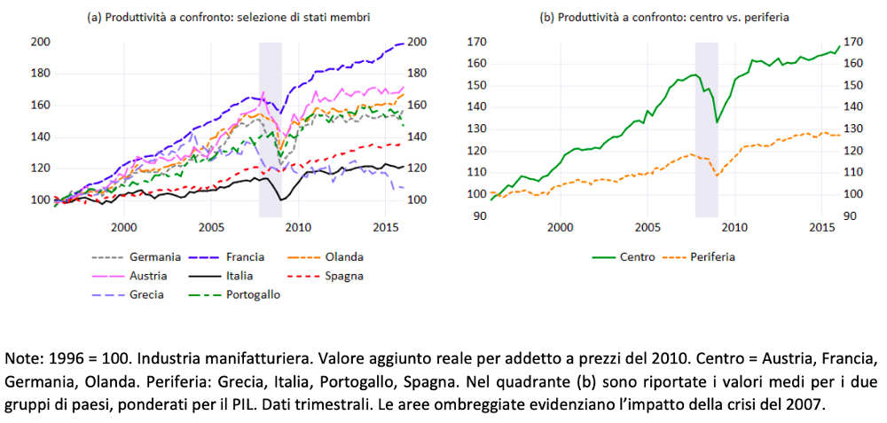 Si nota immediatamente che i paesi del centro capitalistico europeo (Austria, Germania, Francia e Olanda), sono stati caratterizzati da una crescita della produttività più marcata rispetto ai paesi periferici (Grecia, Italia, Portogallo e Spagna) durante l’intero periodo considerato – quadrante (b). L’andamento della produttività nei paesi del centro è stato piuttosto omogeneo se confrontato con quello del blocco dei paesi periferici – quadrante (b). Quanto ai primi, la produttività è cresciuta prima della crisi finanziaria globale, si è ridotta nel biennio 2007-2009, ed ha conosciuto una ripresa nel periodo successivo. Per contro, dalla metà degli anni novanta alla metà dei duemila le due maggiori economie periferiche, Italia e Spagna, sono state caratterizzate da una produttività del lavoro stagnante, mentre Grecia e Portogallo stavano recuperando terreno rispetto al resto dell’Area Euro. Dopo la crisi statunitense del 2007 e la conseguente crisi finanziaria globale, la produttività del lavoro è tornata a crescere in modo sostenuto nella penisola iberica, mentre è rimasta pressoché piatta in Italia. Nello stesso periodo, la Grecia ha registrato una caduta piuttosto marcata.