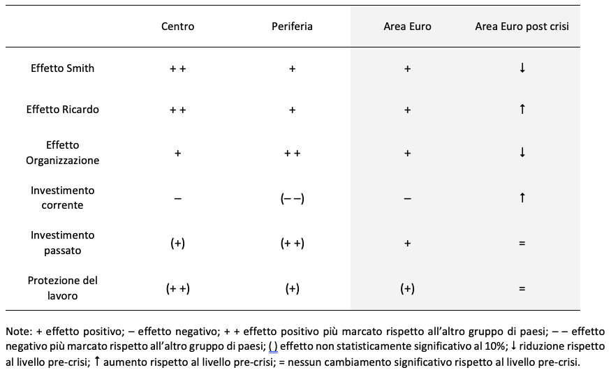 I due gruppi di paesi sembrano inoltre caratterizzati da diverse sensibilità alle determinanti della produttività del lavoro. Mentre i paesi del centro sembrano reagire maggiormente a variazioni nell’estensione del mercato dei prodotti e nel costo relativo della forza-lavoro rispetto ai macchinari, la produttività dei paesi periferici sembra essere più sensibile al costo assoluto del lavoro. Anche l’effetto disturbo degli investimenti correnti sembra essere maggiore per le periferie europee rispetto al centro. Una possibile spiegazione è che la maggiore intensità di ricerca che caratterizza le produzioni manifatturiere dei paesi del centro implica maggiori rendimenti di scala e dunque una maggiore sensibilità all’estensione del mercato (effetto Smith). Per la stessa ragione, le imprese manifatturiere del centro capitalistico europeo sarebbero più inclini ad aumentare il grado di macchinizzazione dei processi produttivi quando il tasso di crescita dei salari supera il tasso di crescita dei prezzi dei macchinari (effetto Ricardo). Per contro, la minore intensità di ricerca delle produzioni periferiche spiegherebbe perché Grecia, Italia, Portogallo e Spagna siano, nel complesso, più sensibili al cambiamento nel costo assoluto del lavoro (effetto organizzazione). Si noti, tuttavia, che l’aumento di competitività dovuto ai minori salari è parzialmente eroso dalla riduzione degli investimenti di efficienza e dalla conseguente caduta relativa della produttività del lavoro.