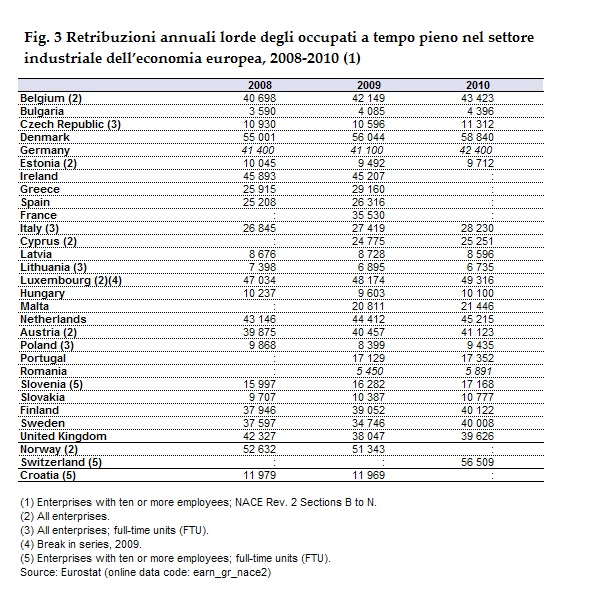 Una interpretazione solo parzialmente diversa da quella discussa prima è quella di chi imputa i bassi salari a un costo del lavoro troppo alto pagato dalle imprese che operano in Italia rispetto al valore aggiunto prodotto. Anche in questo caso si tratta di una affermazione discutibile, dal momento che - come è stato osservato su questa rivista[5] - anche a voler prescindere dai problemi di misurazione il costo del lavoro medio per occupato resta in Italia basso rispetto ai paesi concorrenti, solo poco più alto della media dell’Unione Europea (27 paesi) e decisamente più basso che in Gran Bretagna, Francia, Germania e Svezia.