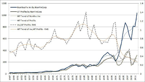 Messa così la faccenda è però troppo semplice. Il fatto è che l’intervallo di tempo selezionato nel grafico di Carchedi e Roberts è eccessivamente breve per trarne conclusioni generali. Vediamo invece il grafico seguente, che esibisce il movimento della massa nominale dei profitti netti (linea scura tratteggiata) e degli investimenti non residenziali delle corporations non finanziarie americane dal 1947 al 2012 (linea grigia continua): le corporations non finanziarie sono ovviamente la sezione dinamica dell’economia, quella responsabile per il processo di accumulazione, e con esse i loro profitti e investimenti. E quando si ha a che fare con l’accumulazione il riferimento è sempre dato dai profitti netti (al netto di interessi e tasse) perché è su questi che i capitalisti commisurano le proprie azioni ovvero sono questi i profitti che possono influenzare direttamente l’accumulazione.