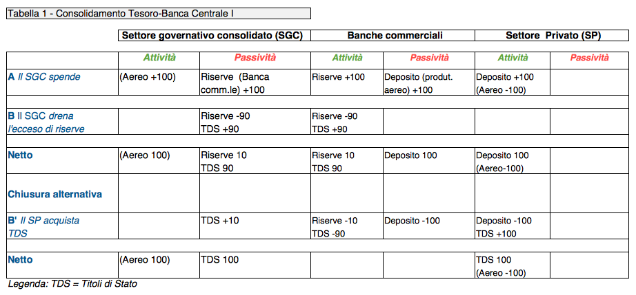 Come è noto, la logica keynesiana secondo cui lo Stato deve essere in grado di spendere per primo ha portato la MMT alla formulazione della famosa e controversa ipotesi del consolidamento, che richiamo brevemente. L'idea è che, al di là di alcune complicazioni e artifici istituzionali, è logico e legittimo considerare il Tesoro e la Banca Centrale (BC) come componenti di una sola ed unica istituzione (poiché entrambi appartengono al settore pubblico), che possiamo definire come il settore pubblico aggregato. Supponiamo che il settore pubblico aggregato (o consolidato) voglia acquistare un aereo del valore di 100 (misurato in una qualsiasi unità di conto) dal settore privato (Tabella 1, vedi Wray 2011b, caso 1b). Secondo l’ipotesi del consolidamento, quello che il settore pubblico aggregato fa è di staccare un pagherò in favore del produttore dell’aereo, che quest’ultimo andrà a depositare presso una banca commerciale.