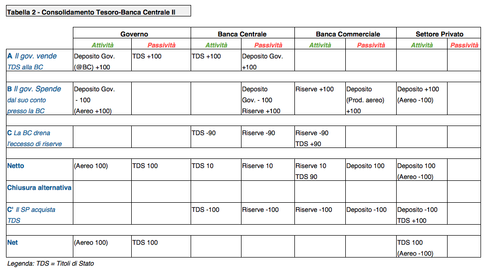 Possiamo complicare un po’ il quadro ipotizzando che il settore pubblico consolidato possegga due sotto-settori, chiamati Tesoro e BC - la Tabella 2 è una variazione della Tabella 1 di Lavoie, 2013. La prima riga della Tabella 2 mostra la creazione da parte della BC di un deposito per il governo, il quale emette una corrispondente quantità di buoni del Tesoro.