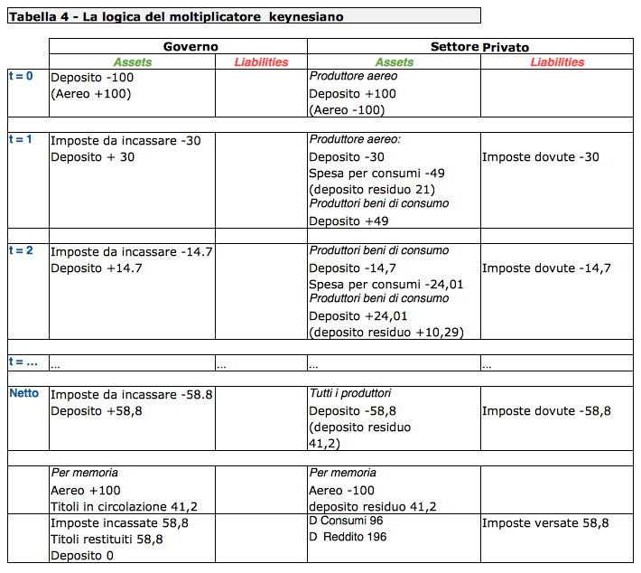 Quanto visto è la rappresentazione standard della tesi MMT (ad esempio Wray 1998: cap. 4), a cui aggiungiamo ora un ulteriore tocco keynesiano. La spesa pubblica per l'acquisto dell'aereo genera un processo di moltiplicazione del reddito che, data l'aliquota d'imposta media, genera entrate fiscali che, ceteris paribus, possono in tutto o in parte andare a coprire la spesa iniziale. Alla fine, la parte di spesa che non è "rimborsata ex post" dalle entrate fiscali sarà "finanziata ex post" dai risparmi del settore privato. 5