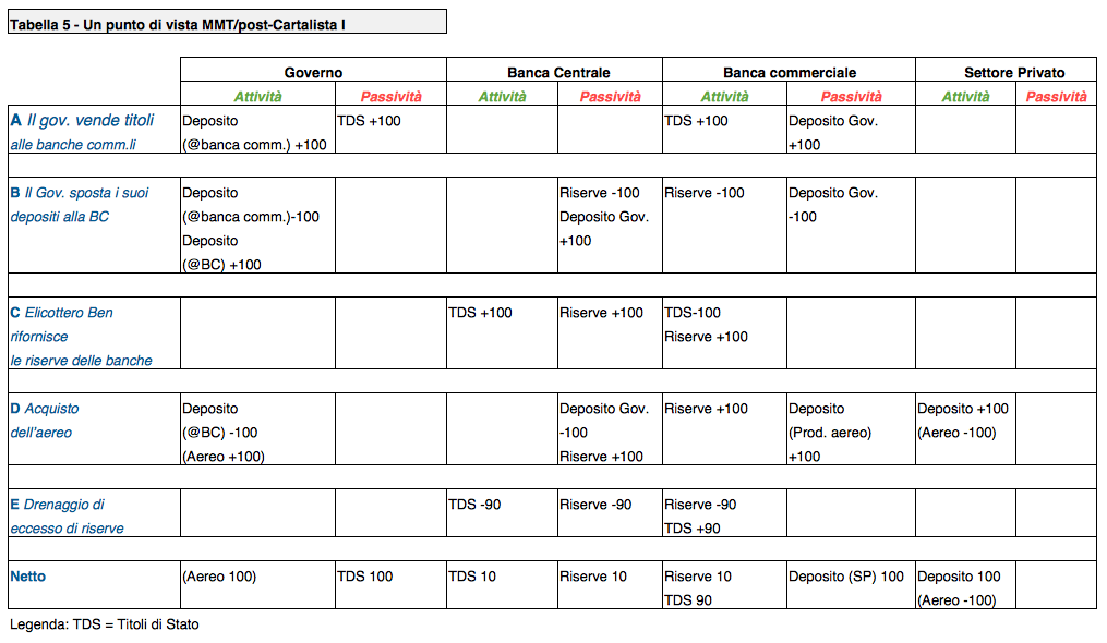 Come nella Tabella 3 (linea F), il governo può rimborsare quindi alle banche 58,8 di buoni del Tesoro emessi all’inizio, mentre il settore privato può impiegare 41,2 di deposito per acquistare i rimanenti. 6