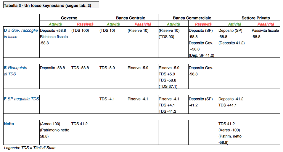 Nella linea D il settore privato paga 58,8 di tasse. Nella fila E il Tesoro utilizza le entrate fiscali per il riacquisto di obbligazioni pari a 58,8. Nella fila F il settore privato acquista dalla banca commerciale le obbligazioni del Tesoro residue. "+/- Patrimonio netto" ci ricorda “l’esproprio" da parte del governo di una parte del valore del velivolo per mezzo della tassazione.