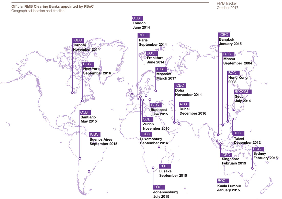 È evidente come negli ultimi anni a tale crescita sia corrisposta un’espansione globale, una ricerca puntuale di spazi entro i maggiori centri finanziari nazionali e internazionali del globo e, a ogni nuova filiale riconosciuta, un aumento percentuale a due cifre dell’impiego di RMB nelle transazioni (per esempio, l’aumento di utilizzo dei RMB nel commercio con gli USA dopo l’apertura della Bank of China a New York nel 2016 era stato, un anno esatto più tardi, del 17%).
