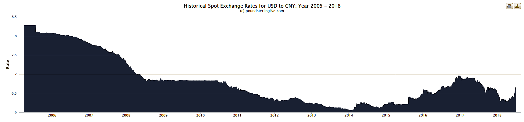 Anche l’ancoraggio al dollaro ha subito mutamenti notevoli: dai 8,2766 RMB per dollaro del cambio fisso del 2005, a oggi, la moneta cinese si è apprezzata circa di 2 RMB, come mostra questo grafico19 , toccando il minimo di 6,0486 RMB nel gennaio del 2014, per poi risalire di mezza unità: