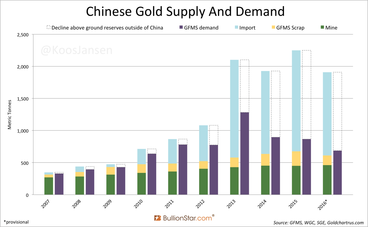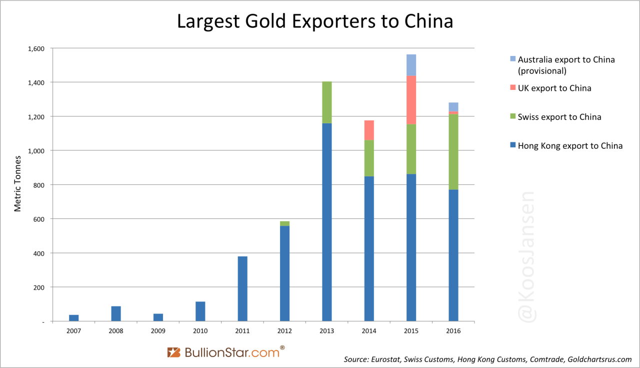 Sempre da Jansen, per esempio, sappiamo che circa 1300 tonnellate sono importate nel solo 201638 , e che l’oro cinese importato in quell’anno superava già nel 2016 le 5 mila tonnellate39 . Quella che segue è una sua tabella che mostra chiaramente, anno per anno, quanto oro importa la RPC e da chi:
