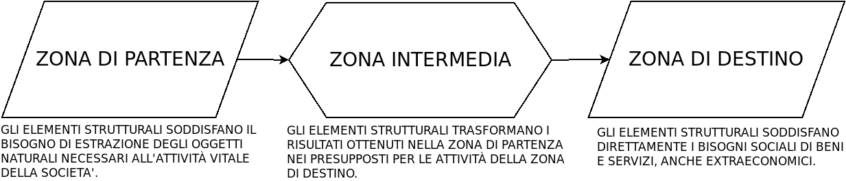 1. zona di partenza (исходная зона), dove gli elementi strutturali soddisfano il bisogno di «estrazione» (извлечение) degli oggetti della natura necessari all’attività vitale della società;